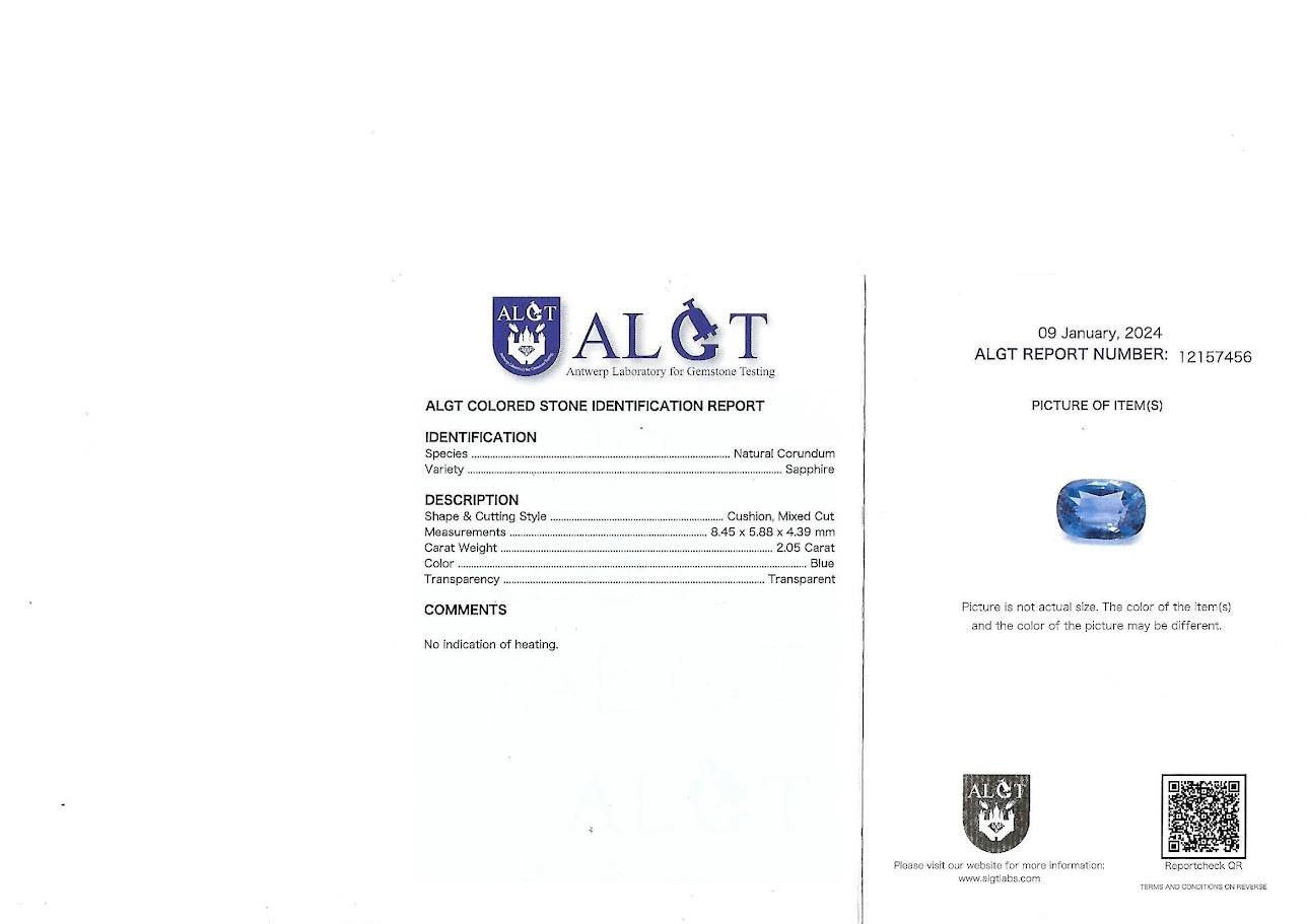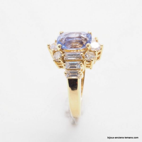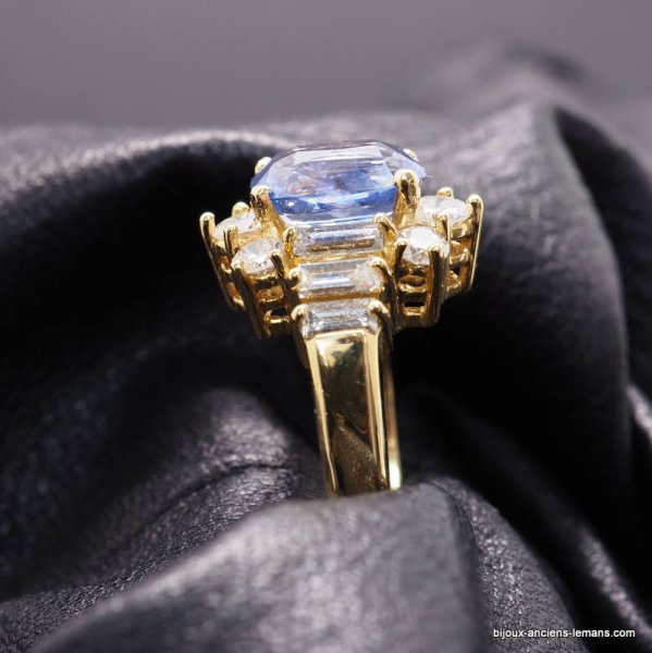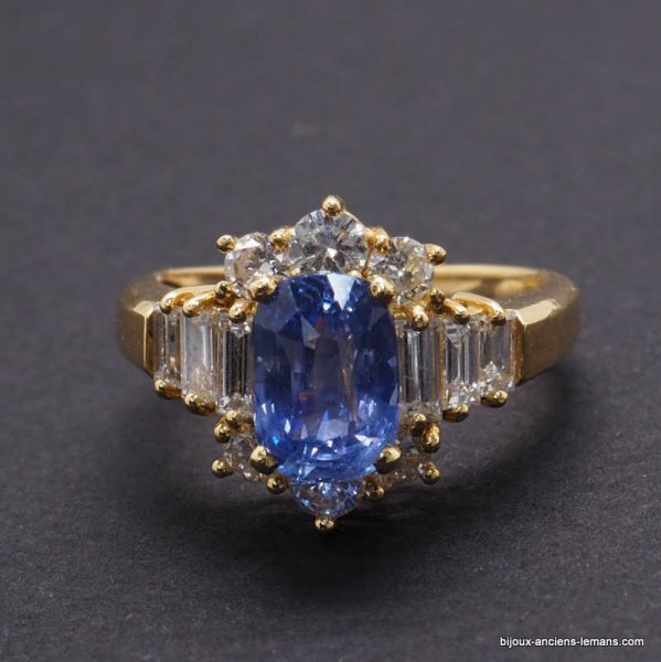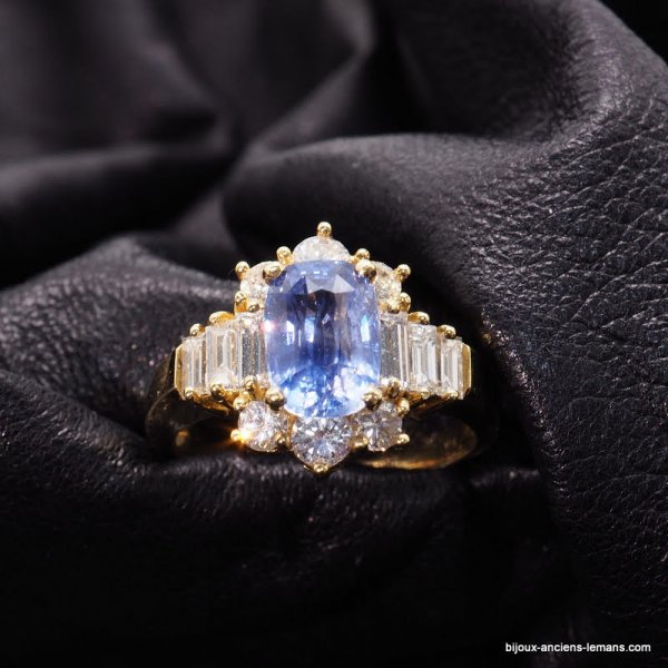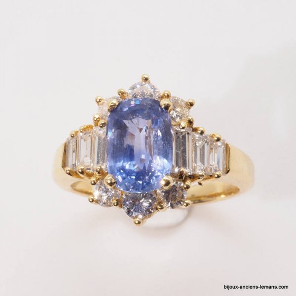 Bague joaillerie or jaune 18 carats serti d'un saphir certifié non chauffé Sri Lanka de 2 carats 05, épaulé de diamants baguettes et entouré de diamants taillés en brillant