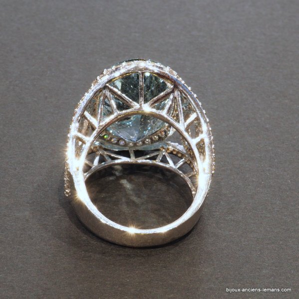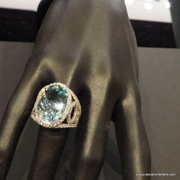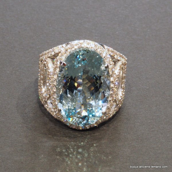 Importante bague en or blanc 18 carats sertie d'une aigue marine encadrée de lignes de diamants