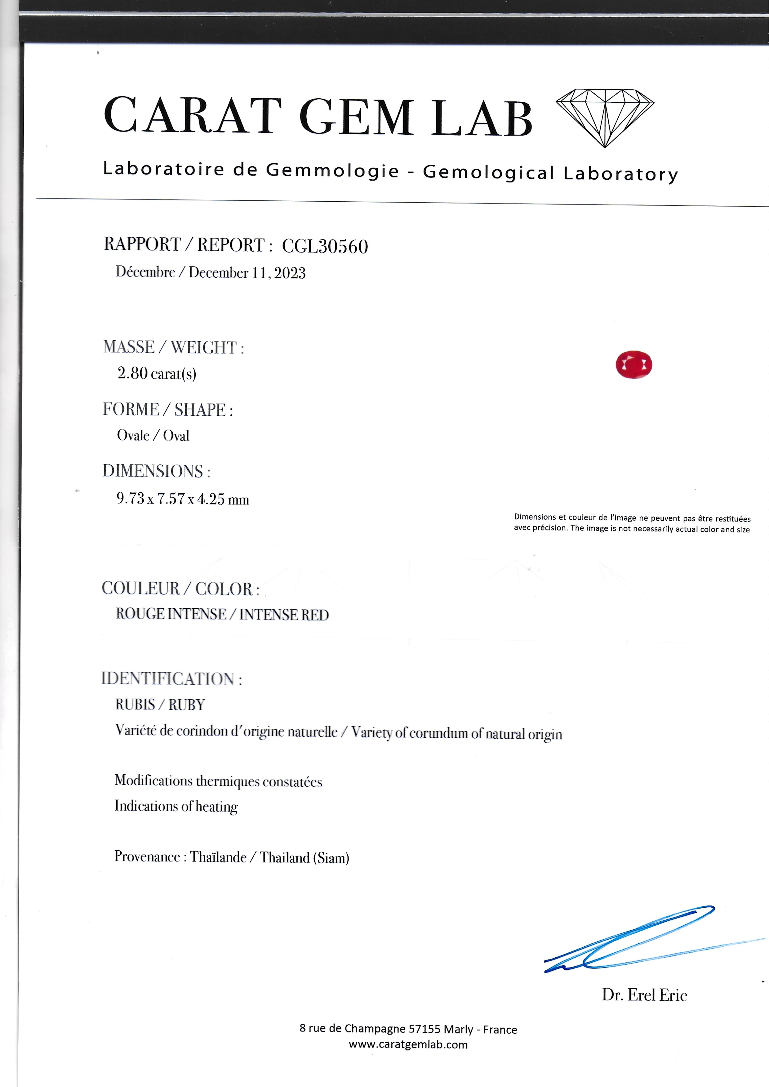 bague or blanc 18 carats 750/000 sertie d'un rubis pesant 2.80 carats certifié carat gemp lab provenant du siam (thailande) entouré d'une guirlande de diamants taillé en brillant